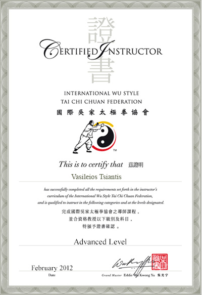 When I was a child, attending a Martial Art in my country was quite difficult. Not only due to lack of information but also due to lack of teachers. The only known Martial Art was Karate. As a consequence at the age of fifteen, I started my training on Shotokan Karate. Unfortunately, some bad training advices and my non-limited passion for the Art had as result my injury; my passion had an unexpected and painful end. I was really disappointed then, but now I feel that it was for good. I never quite training on my own, so 6,5 years ago, at the age of 32, an article and my always existing love for the Martial Arts leaded me to the school of my teacher Mr. Dionisis Tsetselis. Mr. Tsetselis was teaching, that time, a style of Tai Chi Chuan based on the style of the Wu Family. I immediately understood that Tai Chi Chuan is the Martial Art that is the most suitable to me. In continuance of my training, and always with the accordant opinion of my teacher, I participated in various seminars concerning Chi Kung and Ba Gua Zhang, having always as goal to enrich my knowledge in other inner Arts and systems and obtaining a more spherical idea on the philosophy of the Chinese Martial Arts. The great love of Mr. Tsetselis not only for our Art but also for his students, accompanied by his faith that we should contact directly the Source for our further progress, directed him to contact in 2006 the Grand Master Wu Kwong Yu, Gate Keeper of the Wu Family. After the first seminars with the representative of Grand Master Wu, sifu Chuang Shiou Huey, we realized the depth and the amplitude of the authentic Tai Chi Chuan of Wu Family. After that and having done enormous efforts in our school, we had the great honor to meet Grand Master Wu. He appreciated our work and he accepted our school to the International Wu Style Tai Chi Chuan Federation. Meeting in person Grand Master Wu was for us an unprecedented experience. His deep knowledge, his direct and meaningful speech and mostly his great paternal love about the Art and the students, made us love more our Art and continue our route with bigger fervency.