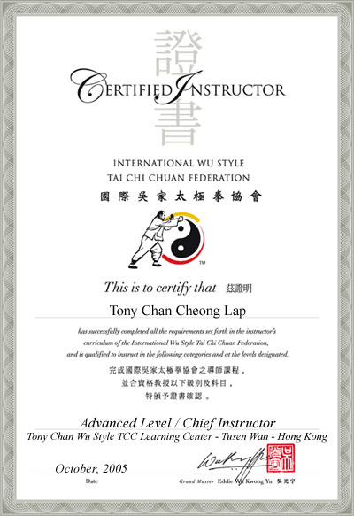 Chief Instructor at Tony Chan Wu Style Tai Chi Chuan Learning Center (Tsuen Wan - Hong Kong) In the past 40 odd years, I have been practising Tai Chi Chuan and Push-hand exercises with my friends. In the 1980's, I started giving lessons at my leisure time. At present, I am organizing and teaching Wu Style Tai Chi Chuan classes in Tony Chan Wu Style Tai Chi Chuan Learning Center (Tsuen Wan) (previously named: Ho Fung College), Hong Kong to friends and members of the Ho Fung College Alumni Association and Ho Fung College PTA. Lessons are held on Sundays from 10 am to 1 pm. Programs for 2003 will include Wu Style Tai Chi Chuan, Tai Chi Sword, Push-Hand exercises, and self-defense Techniques. I started to learn Wu Style Tai Chi Chuan in 1956 from Master Wu Tai Kwei. I was much honoured to become his first disciple, and learnt much from his teachings. After Master Wu Tai Kwei passed away, I continued to receive lessons from Masters Wu Kung Cho, Wu Tai Sin and Wu Tai Chi. In order to further promote the Wu Style Tai Chi Chuan, I published a book on Push-hand exercises as a co-author in 1996 entitled "Tai Chi Push-hand Exercises Teaching Guide". From 1995 to 1997 I was a member of the HK Education Department Advisory Committee responsible for introducing Tai Chi Chuan to the Physical Education Curriculum in secondary schools in Hong Kong. This included the preparation of teaching materials, video-tapes and training of PE teachers. Since 1992, I have served as member of the Executive Committee of the H.K. Wushu Union, responsible for promoting the chinese martial art in HK and abroad. In 2001, I was the Team Leader of the HK Wushu Team to the East Asian Games in Osaka, Japan. In 2002, I was again the Team Leader of the Wushu Team to participate in the Asian Games held in Busan, Korea. |