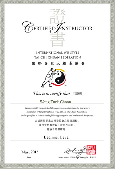 I first heard about Wu Tai Chi Chuan from the first seminar conducted by Grandmaster Eddie Wu Kwong Yu and instructors from the Singapore Wu Tai Chi Chuan Academy in 2005. I was looking for an "age-proof" therapeutic art which can be practised and sustained through the years. Shortly after, I enrolled for the beginner class under the instruction of Sigu Saw Phaik Hwa and Sisu Goon Ark Leau. Since then, It was the beginning of a timeless learning and discovery journey over the past decade and for many more years to come. My health benefited immensely from practising Wu Tai Chi Chuan. I am privileged to have the opportunity to continue the development of my skill and knowledge of Wu Tai Chi Chuan under the guidance of Grandmaster Eddie Wu, Sigu Phaik Hwa and all the Sisu in the Singapore Academy. |