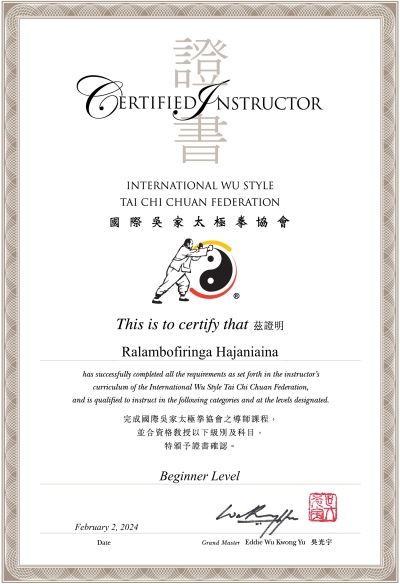 Capt Ralambofiringa Hajaniaina is a former airline pilot of national flag carrier Air Madagascar. After being a student of the Yang Family Tai Chi Chuan from 2014 and passed the Duan 2 he assisted in 2019 at Selvino Italy to the Symposium of TAICHI (presence of the 5 grand master of the five style of main TAICHI)organised by the Yang family and he got to know Jonathan Krehm and Evonne Tan of WU 'S Tai Chi Chuan Academy Toronto . Haja started training in person in Toronto when he travelled there to take aviation courses at the CAE training center of De Havilland Twin Otter. “ TAICHI is a one family I feel honoured to have been taught and coached by Jonathan in Wu style Tai Chi Chuan since 2019 to nowadays and aspire to go beyond .” |